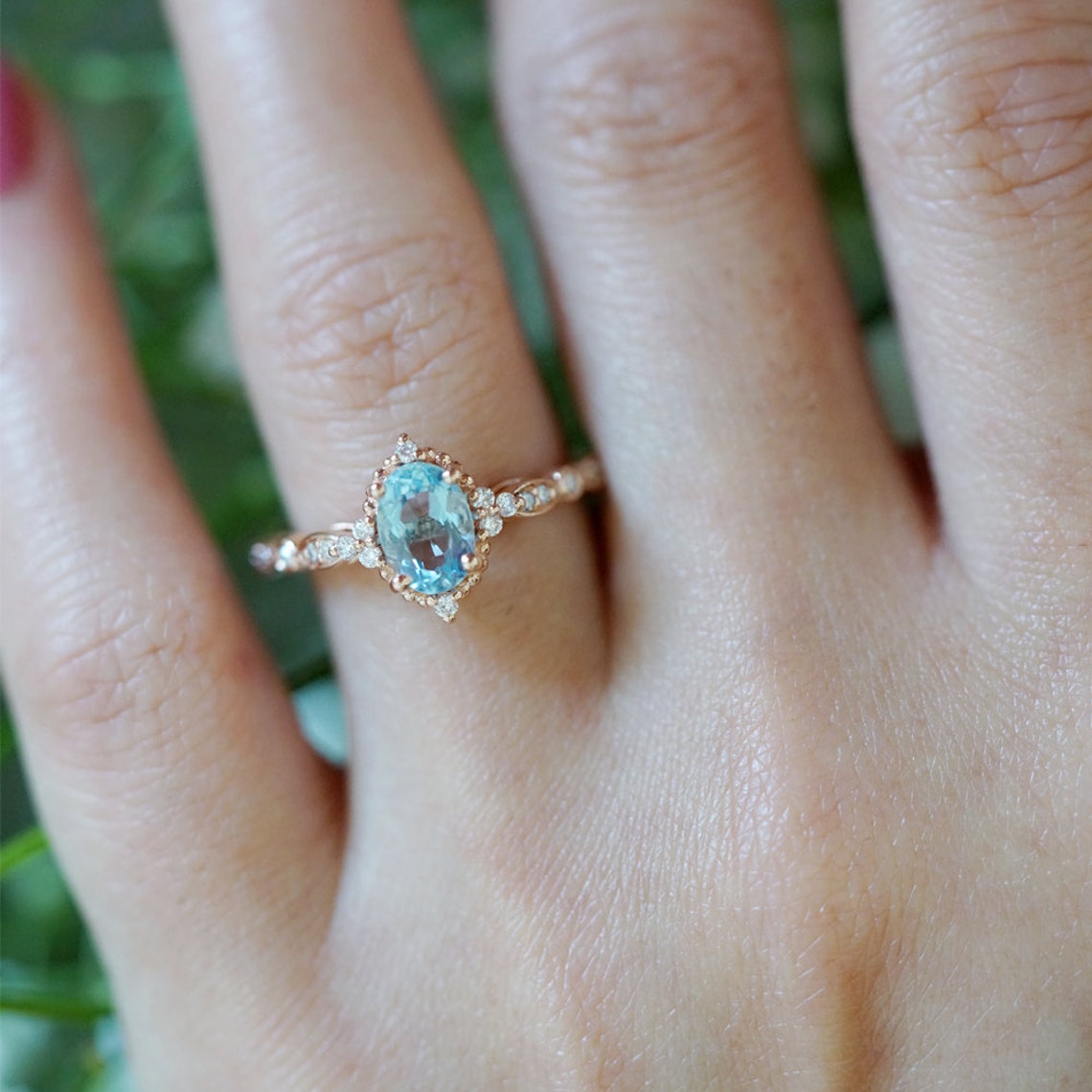 Rose Gold Halo Aquamarine Ring Set Aquamarine Engagement Oval Bridal Ring Set Blue Stone